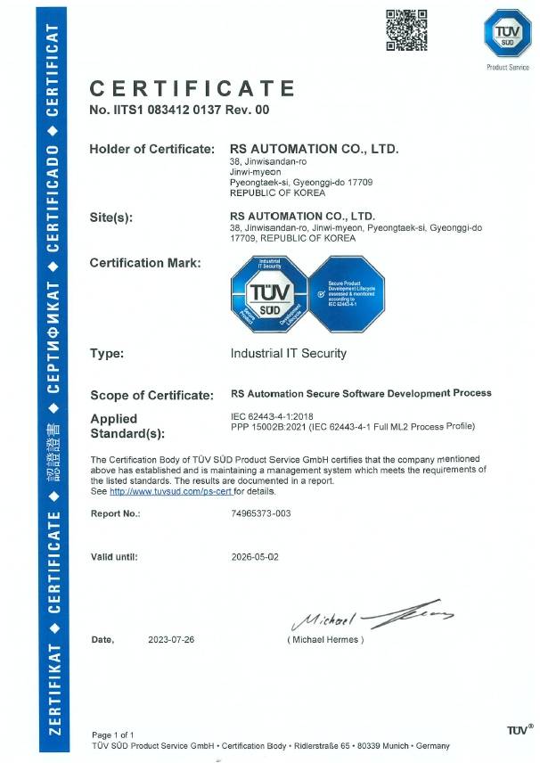 강덕현 알에스오토메이션 대표는 “사이버 보안 인증은 이제 수출을 위한 필수 자격으로 미국 로크웰오토메이션과 공동개발 중인 스마트 컨트롤러에 국내 로봇 기업 최초로 해당 소프트웨어를 탑재할 계획”이라고 말했다.