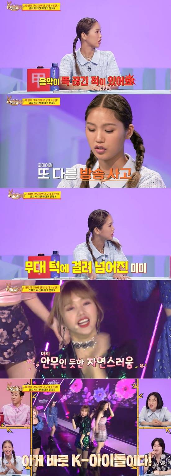 이날 미미는 방송 사고 경험을 묻는 질문에 "아무래도 공연을 많이 다니다 보니까 있다. 후렴 부분에서 갑자기 음악이 끊긴 거다. 멤버들이 무반주에 이어서 불렀다"라며 프로다운 대처 능력을 과시했다.