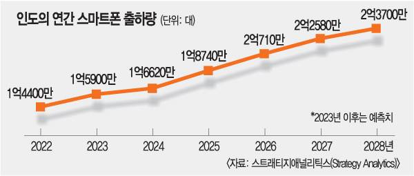 31일 시장조사업체 스트래티지애널리틱스(SA)에 따르면 올해 인도의 스마트폰 출하량은 1억5900만대로 추산된다. 지난해(1억4400만대)보다 10.4%나 증가한 규모다. 세계적 경기 침체에도 나홀로 성장세를 기록하며 2028년 2억3700만대까지 출하량이 늘어날 것으로 예측된다.