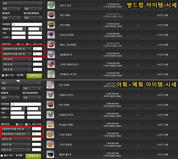 쌍드랍 장비는 하프 이어링을 제외하고 최소 120억 이상부터 시작하는 반면, 아획+메획 아이템은 70억 선부터 시작한다. 여유 자금이 충분하지 않다면 메획 상한치인 100%까지는 섞어 구매하는 것이 자금 면에서 효율적이다.
