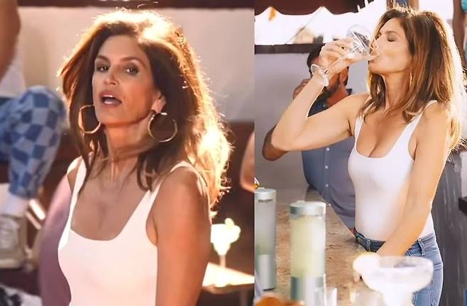 신디 크로포드는 31년 전과 같이 흰색 민소매에 데님 반바지를 입고 슈퍼 모델의 자태를 자랑했다. 영상 속 신디 크로포드는 빨간 빈티지 차량에서 내려 술집으로 향해 데킬라를 마셨다. 그는 헤어스타일까지 똑같이 표현하면서 나이를 초월한 얼굴과 몸을 선보였다.