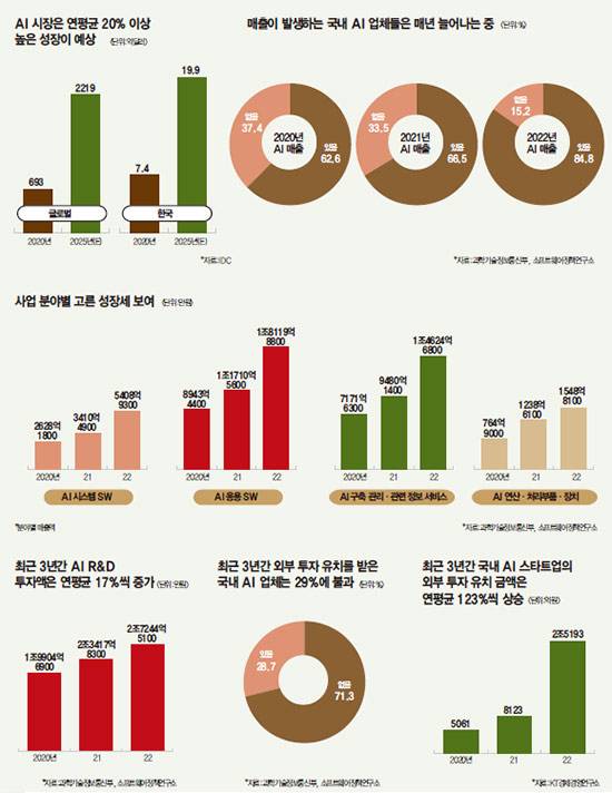 물론 기대감만 있는 것은 아니다. 실체도 분명하고 성장세도 있다. 각 기업이 AI를 활용해 실제로 돈을 벌고 있다는 통계가 이를 증명한다. 과학기술정보통신부, 소프트웨어정책연구소는 1900여개 기업을 상대로 인공지능을 활용해 매출을 일으키고 있는지를 조사해봤다. 자료에 따르면 각 기업이 AI를 활용해 매출을 일으키는 비율이 2020년 62.6%에서 지난해 84.8%로 껑충 뛰었다. 더불어 AI 인프라 산업도 기지개를 켜고 있다. AI 산업이 성장하기 위해서는 데이터센터, AI 반도체, IT 솔루션 등 연관 산업이 동시에 성장해야 한다. 리벨리온, 사피온코리아, 퓨리오사AI, 파두 등 AI 관련 반도체 설계 특화 기업이 속속 등장해 유니콘 기업으로 떠오르거나 상장에 성공하면서 관련 산업 미래도 밝히고 있다.