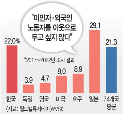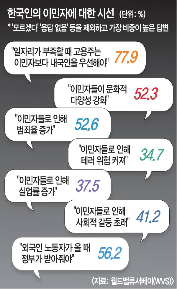 저출산·고령화에 대응하는 이민정책에서 빠뜨릴 수 없는 과제는 사회통합 방안을 촘촘히 설계하는 일이다. 한국인에게 실존하는 외국인 차별·편견을 그대로 두고 경제적 효과만 따지는 일은 성공적일 수 없다는 게 전문가들의 말이다. 동시에 현재까지 드러난 지역사회의 슬럼화, 외국인을 중심으로 증가하는 마약범죄 등 부작용을 손보는 일도 필수적이다.