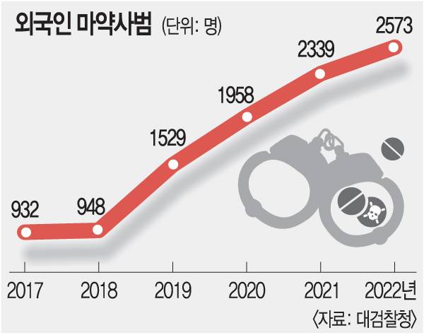 외국인 범죄율이 내국인 범죄율에 비해 높지 않음에도 일부 사례가 정치적 목적으로 부풀려진다는 지적이 그간 많았다. 다만 마약에 대해서는 체류 외국인의 증가와 범죄의 확대가 유의미한 관계임이 입증돼 있다. 지난해 말 기준 마약류범죄로 단속된 외국인은 2573명으로 4년 전보다 171.4% 늘었다. 전체 마약류사범의 증가 폭(45.8%)에 비해 크게 두드러진 수치다. 대검찰청은 “전체 마약류사범 중 외국인 비중이 14%지만 밀수사범 중 외국인 비중이 약 40%”라며 “외국인에 의한 마약류 밀수가 심각하다”고 했다.