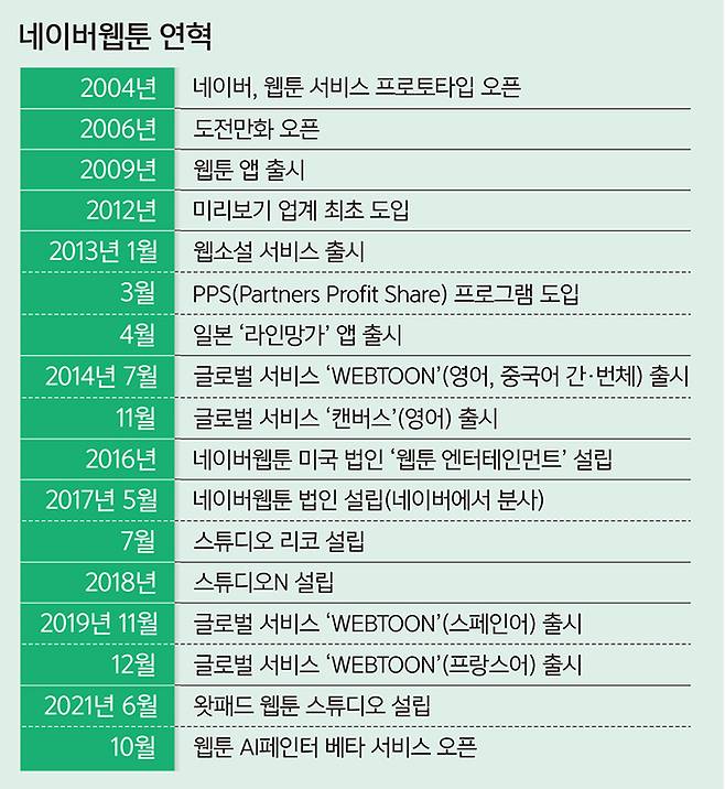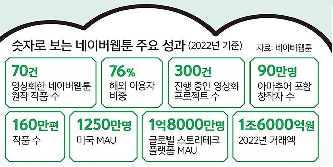 현재 네이버웹툰의 전 세계 월간 활성이용자수(MAU)는 1억8000만명, 창작자는 600만명에 달한다. 모바일 애플리케이션(앱)마켓 분석업체 데이터에이아이 집계 결과를 보면 지난 6월 미국에서의 네이버웹툰 월간 이용자 규모는 2위 사업자보다 7배 이상 높은 1위를 기록했다. 프랑스 웹툰·만화 앱 시장에서도 네이버웹툰이 매출과 활성이용자(AU) 부문 등에서 1위다.