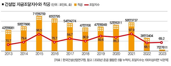2015년과 2021년 착공 물량은 각각 71만6759호, 58만3737호로 10년 평균인 52만9874호를 훌쩍 넘었다. 자금조달 지수가 높았을 때 착공 물량도 증가한 셈이다. 최근엔 어떨까. 지난 6월 기준 자금조달지수는 69.2다. 2022년 12월(68.1)과 크게 다르지 않다. 민간 공급의 위축 현상이 당분간 이어질 가능성이 높다는 거다.