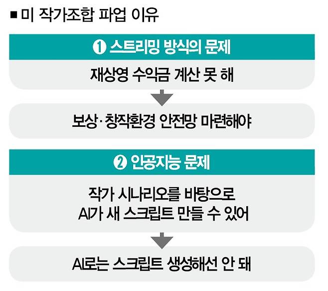 작가들의 입장은 단호하다. 지금의 스트리밍 방식으론 재상영에서 파생하는 수익금을 계산할 수 없으니 보상과 창작환경의 안전망을 마련하라는 것이다. 작가들이 작업한 시나리오와 각본을 바탕으로 AI를 활용해 새로운 스크립트를 생성해선 안 된다는 것도 이들의 주장이다.