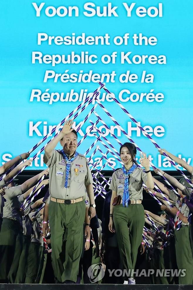 (부안=연합뉴스) 임헌정 기자 = 윤석열 대통령과 김건희 여사가 2일 오후 전북 부안 새만금 부지에서 열린 '2023 새만금 제25회 세계스카우트잼버리' 개영식에서 스카우트 최고의 예우를 표하는 장문례를 받으며 입장하고 있다. 2023.8.2 [대통령실통신사진기자단]