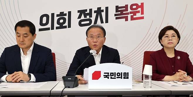 與 ‘LH 철근누락’ 관련 간담회 국민의힘 윤재옥 원내대표(가운데)가 2일 국회에서 열린 무량판 공법 부실시공 관련 기자간담회에서 발언하고 있다. 윤 원내대표는 이날 “LH 퇴직자들이 몸담은 전관 업체 문제가 면밀히 조사돼야 한다”고 주장했다. 서상배 선임기자