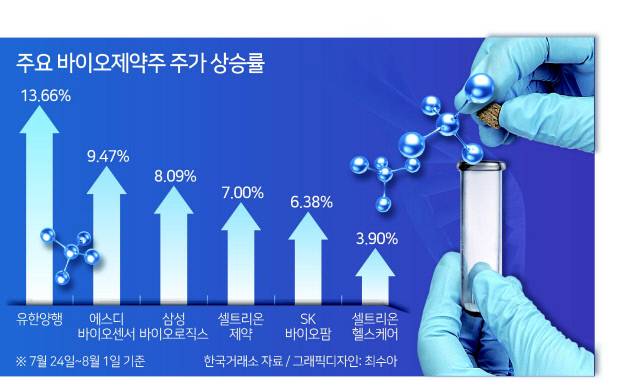 3일 한국거래소에 따르면, 지난달 24일부터 8월 1일까지 ‘KRX 바이오 K-뉴딜지수’는 6.9% 오른 것으로 나타났다. 이 지수는 삼성바이오로직스·셀트리온·셀트리온헬스케어·SK바이오팜·SK바이오사이언스 등 제약바이오 시가총액 상위 10개 종목으로 구성돼 있다. 지난 7일 동안 유한양행(13.7%), 에스디바이오센서(9.5%), 삼성바이오로직스(8.1%), 셀트리온제약(7%) 등이 올랐다. 이 기간 KRX300 헬스케어(5.1%), KRX 헬스케어(4.4%)도 일제히 상승세를 탔다.