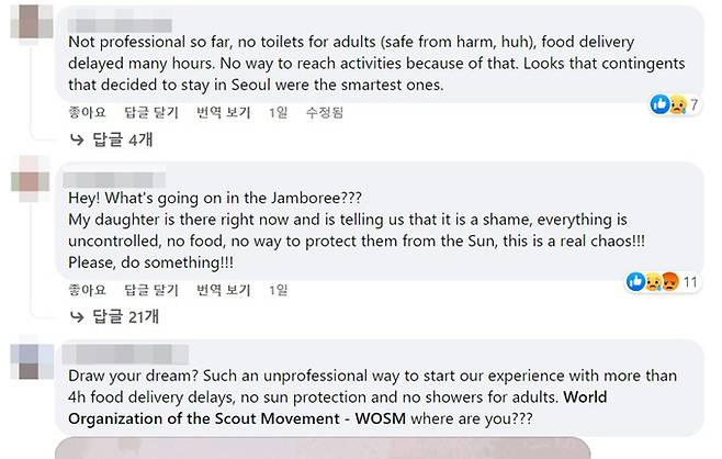 세계스카우트연맹(WOSM) 페이스북에도 “음식, 위생, 그늘 부족 등의 모든 문제로 잊을 수 없는 부정적인 경험이 될 것”이라는 글이 올라왔다.