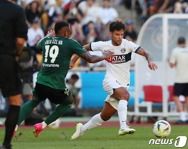 (부산=뉴스1) 윤일지 기자 = 3일 오후 부산시 연제구 부산아시아드주경기장에서 열린 쿠팡플레이 시리즈 3차전 전북 현대와 파리 생제르맹 FC의 경기 전반전에서 PSG 후안 베르나트가 전북 하파 실바를 피해 드리블하고 있다. 2023.8.3/뉴스1