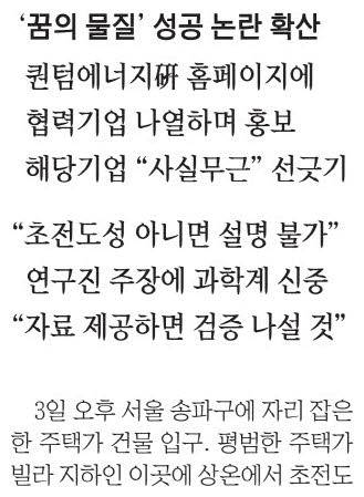 3일 오후 서울 송파구에 자리 잡은 한 주택가 건물 입구. 평범한 주택가 빌라 지하인 이곳에 상온에서 초전도체(LK-99)를 개발했다고 주장하는 '퀀텀에너지연구소'가 있다. 간판조차 없어서 무심코 지나갈 만한 곳이지만 세간의 이목이 집중된 만큼 많은 기자가 현장을 찾았다. 기자들이 지하에 내려가 문을 두드리지만 침묵만 이어진다. 잠시 후 건물 입구에 경찰차가 멈춰 선다. 언론 취재에 대응하고자 연구소 측에서 경찰을 부른 것이다. 한 경찰관은 "현재 사무실에 직원들이 있지만 취재에 응하기 어려운 상황"이라며 "취재를 삼가달라"고 말했다. 경찰관의 제지에 기자들이 자리를 뜨려고 할 때 한 남성이 나타나 무슨 일인지 상황을 묻는다.