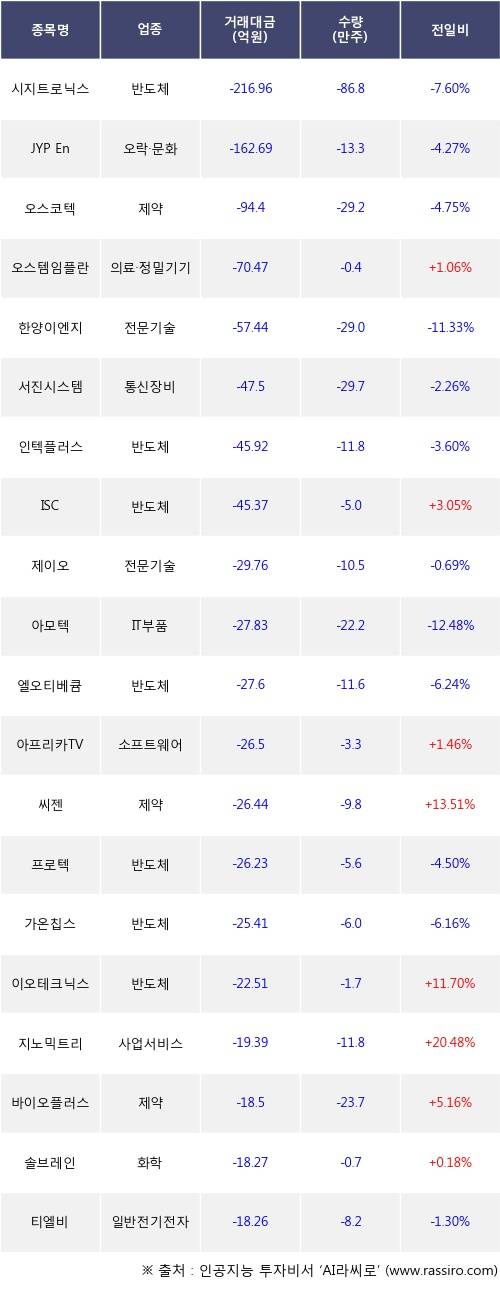 기관 투자자의 순매도 상위 20개 종목은 시지트로닉스, JYP Ent., 오스코텍, 오스템임플란트, 한양이엔지, 서진시스템, 인텍플러스, ISC, 제이오, 아모텍등이다.