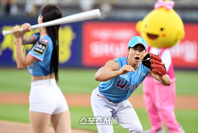 tvN '2억9천 : 결혼전쟁'에 출연 중인 보디빌더 성치현이 3일 수원 KT위즈파크에서 열린 2023 KBO리그 KT 위즈와 SSG 랜더스의 경기에 앞서 시구를 하고 있다. 시타는 프로그램에 함께 출연 중인 KT 치어리더 김해리가 맡았다. 2023. 8. 3. 수원 | 박진업기자 upandup@spotsseoul.com