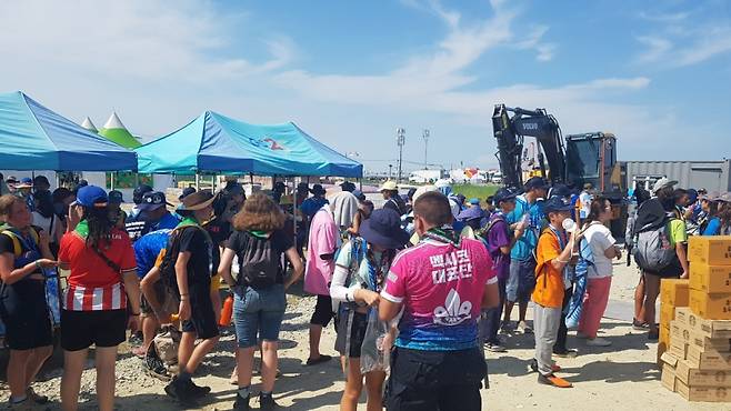 3일 낮 전북 새만금에서 열리고 있는 세계스카우트잼버리대회장 내 편의점에 전 세계에서 온 대회 참가 대원들이 몰려 북새통을 이루고 있었다. 대규모 행사가 열리는 델타지역 내 유일한 편의점인 20여평 규모의 GS25텐트 앞에는 긴 줄이 늘어섰다. 폭염을 피해 편의점에 몰려든 인원은 대기 줄을 포함해 백여명에 가까웠다. 계산줄도 20여명 넘게 서 있었고 물건을 고르기 어려울 정도로 내부에 사람이 꽉 차 있었다.