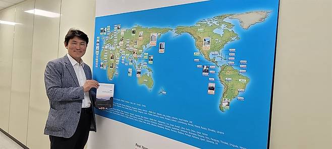 | ▲ 자국어인터넷주소 세계 지도 앞에서 관련 백서인 <인터넷 난중일기> 본인 저서를 들고 있는 이판정 대표 |