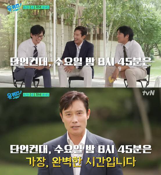 이어 이병헌은 "단언컨대, 수요일 밤 8시 45분은 가장, 완벽한 시간입니다"라고 영화 속 대사처럼 '유퀴즈'의 방송 시간을 언급하는 멘트를 해 눈길을 끌었다.