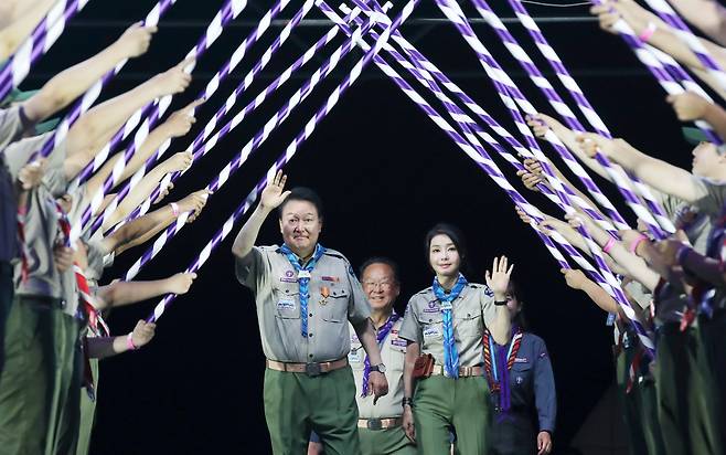 | ▲ 윤석열 대통령과 김건희 여사가 지난 2일 오후 전북 부안 새만금 부지에서 열린 '2023 새만금 제25회 세계스카우트잼버리' 개영식에서 스카우트 최고의 예우를 표하는 장문례를 받으며 입장하고 있다. |