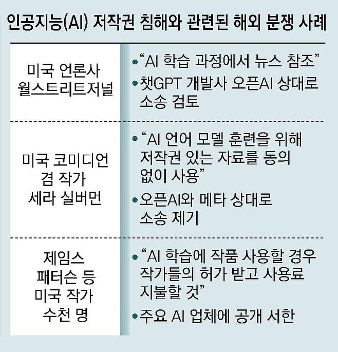 김혜창 한국저작권위원회 정책연구본부장은 “챗GPT 등장 이전에는 AI 산업 발전을 위해 저작권자들이 양보해야 한다는 인식이 있었는데, 지금은 저작권자 권리를 보호해야 한다는 목소리가 점점 높아지고 있다. 사회적 논의가 필요한 때”라고 했다. 해외에서는 유명 작가, 언론사 등이 AI 개발사를 상대로 자신의 저작물을 동의 없이 사용했다며 잇따라 손해배상 소송을 벌이고 있다.