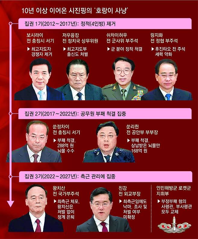 친강이 낙마하면서 그동안 하루아침에 스러져간 중국의 고위 정치인이나 공직자들이 재조명되고 있다. 시 주석은 2012년 말 권력을 잡은 뒤 단 한 번도 쉬지 않고 고위층 사정(査正) 작업, 이른바 ‘호랑이 사냥’을 통해 권력을 강화해 왔다. 그런데 매 시기 사정 작업의 대상은 조금씩 달랐다. 집권 1기(2012∼2017년) 때는 정적 제거에 몰두했고, 2기(2017∼2022년) 전반부에는 부패 공무원, 그리고 2기 후반부터 지금까지는 측근 관리에 집중하는 모양새다. 친강 부장도 이 과정에서 낙마한 것 아니냐는 추정이 나오고 있다.