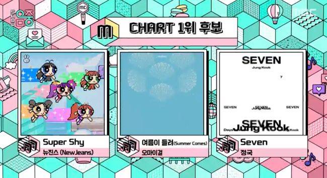 5일 오후 방송된 MBC '쇼! 음악중심'에서는 뉴진스와 오마이걸, 정국이 1위 후보에 올랐다.
