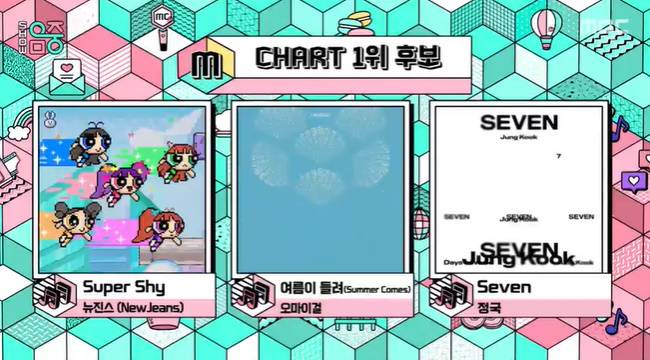 이날 방송에는 뉴진스의 ‘Super Shy’(슈퍼 샤이), 오마이걸의 ‘여름이 들려(Summer Comes)’, 방탄소년단 정국의 ‘Seven’(세븐)이 1위 후보로 공개 됐다.