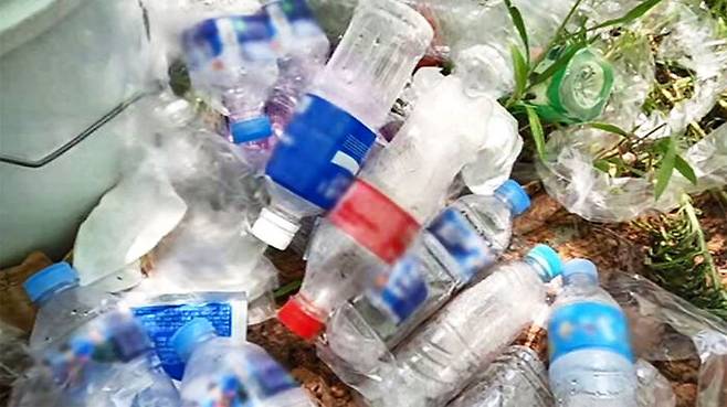 이쪽을 보시면 여러 생수통, 그리고 먹다 남은 쓰레기, 음식물 쓰레기까지 어지러이 놓여있는 것을 볼 수 있고요.