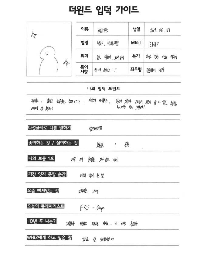Q. 참고로 최한빈은 이날 컨디션 문제로 함께하지 못했어요. 멤버들이 대신 한빈의 프로필을 보며 이야기 나누기로 했죠. 찬원이 한빈과 가장 오래 함께했다고 들었어요.