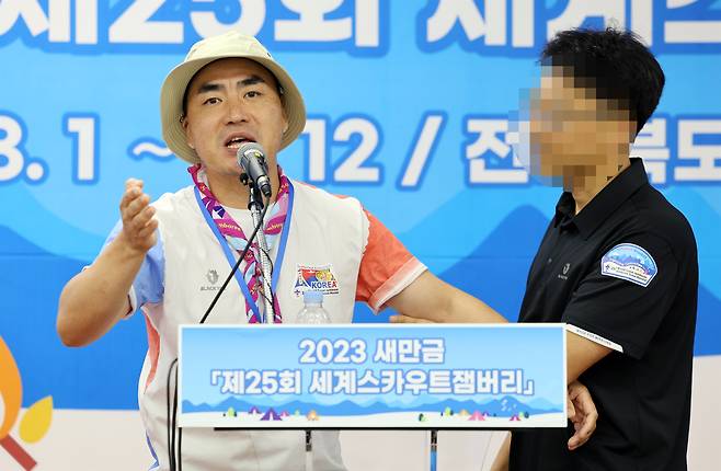 | ▲ 6일 2023 세계스카우트잼버리 프레스센터에서 한국스카우트연맹 전북연맹 지도자가 기자회견을 열고 있다. 이 지도자들은 영내에서 성범죄가 발생해 퇴소하겠다고 밝혔다. |