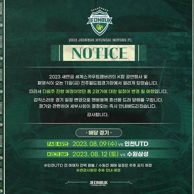 프로축구 K리그1 전북 현대는 6일 소셜네트워크서비스에 “2023 새만금 세계스카우트잼버리의 K팝 공연 행사 및 폐영식이 오는 11일 전주월드컵경기장에서 열리게 됐다. 따라서 다음주 진행 예정이었던 홈 2경기에 대한 일정이 변경될 예정”이라고 발표했다.