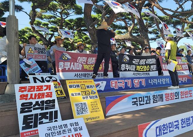 이날 열린 충남대회에서 참가자들은 한목소리로 일본의 핵 오염수 방류를 규탄하는 한편, 윤석열 대통령에대해서도 일본 정부의 입장을 대변하고 있다고 주장했다.