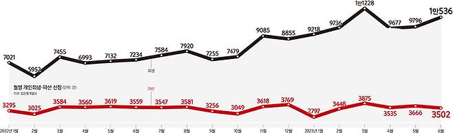 전 재산으로도 모든 채무를 변제할 수 없는 ‘파산사건’에서도 자영업자가 차지하는 비중이 크다. ‘2022년 개인파산사건 통계조사’에서 ‘사업실패 또는 사업소득 감소’가 원인인 경우는 2021년(52.6%)과 2022년(44.7%) 모두 절반가량을 차지했다. 한계에 다다른 채무자 숫자는 앞으로 더 늘어날 것으로 보인다. 전문가들은 공적 지원을 늘리고, 채무조정 제도를 정비해 이들의 재기를 도와야 한다고 주문하고 있다.