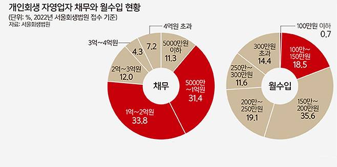 통계상 ‘영업소득자’로 분류되는 자영업자는 월급을 받는 ‘급여소득자’보다 월수입은 적고, 빚은 더 많았다. 지난해 서울회생법원에 개인회생을 신청한 자영업자의 채무 총액 중위값은 1억1402만원으로 급여소득자(8508만원)보다 34%가량 많았다. 전체 채무자 중 월수입이 150만원 이하인 경우는 13% 수준인데 자영업자는 그 비율이 25.5%에 달했다. 이렇다 보니 변제율이 30% 미만인 자영업자는 52.4%로 전체 개인회생 채무자(37.1%)를 크게 웃돌았다.