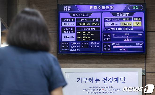 (서울=뉴스1) 이재명 기자 = 올여름 전력수요가 최대치를 기록할 것으로 전망된 7일 오전 서울 중구 한국전력공사 서울본부에 전력 수급 현황이 표시되고 있다. 2023.8.7/뉴스1