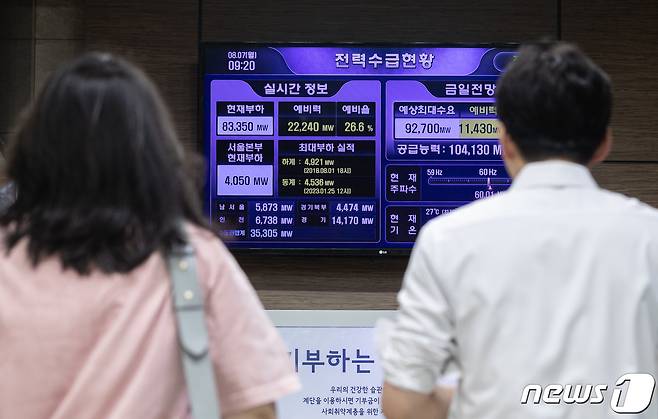 (서울=뉴스1) 이재명 기자 = 올여름 전력수요가 최대치를 기록할 것으로 전망된 7일 오전 서울 중구 한국전력공사 서울본부에 전력 수급 현황이 표시되고 있다. 2023.8.7/뉴스1