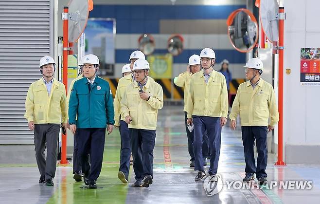 (서울=연합뉴스) 김도훈 기자 = 7일 오전 전력수요 피크 대비 준비상황 점검을 위해 서울 마포구 한국중부발전 서울발전본부를 방문한 이창양 산업통상자원부 장관(왼쪽 두번째)이 임양수 본부장(왼쪽 세번째)의 설명을 들으며 지하발전소 시설을 살펴보고 있다. 2023.8.7