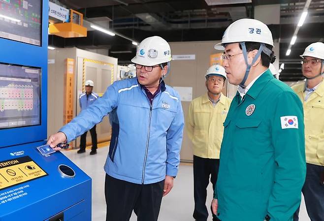 [서울=뉴시스] 이창양 산업통상자원부 장관이 7일 서울 마포구 중부발전 서울발전본부를 방문해 전력수요 피크 대비 준비상황을 점검하고 있다. (사진=산업통상자원부 제공) 2023.08.07. photo@newsis.com