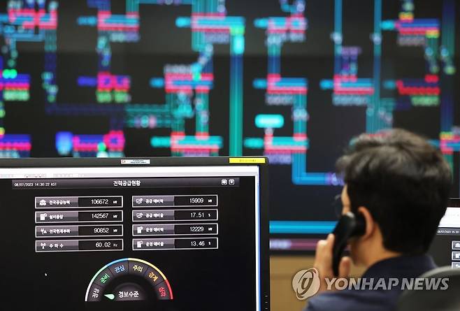 (수원=연합뉴스) 홍기원 기자 = 7일 오후 경기도 수원시 영통구 한국전력공사 경기지역본부 전력관리처 계통운영센터에서 관계자들이 전력수급상황을 주시하고 있다.
