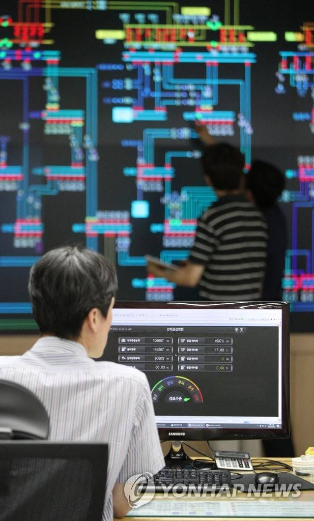 (수원=연합뉴스) 홍기원 기자 = 7일 오후 경기도 수원시 영통구 한국전력공사 경기지역본부 전력관리처 계통운영센터에서 관계자들이 전력수급상황을 주시하고 있다.