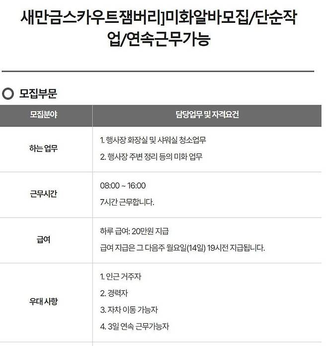 구인구직 사이트에는 ‘잼버리 알바 급구’ 글이 대거 올라오고 있습니다.