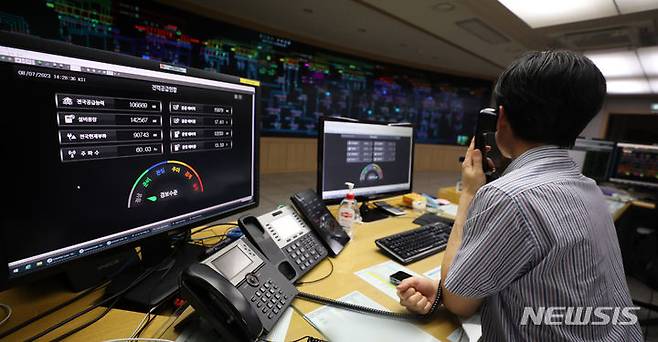 [수원=뉴시스] 김종택 기자 = 올여름 최대 전력수요가 예상되는 7일 경기 수원시 한국전력공사 경기지역본부 전력관리처 계통운영센터에서 직원들이 전력수급상황을 주시하고 있다. 정부는 7일과 8일 오후 전력 수요가 92.9GW(기가와트)까지 높아지면서 올여름 최대치를 기록할 것으로 전망했다. (공동취재사진) 2023.08.07. photo@newsis.com