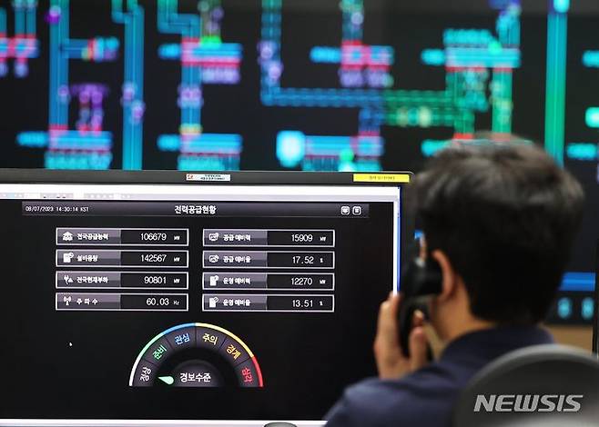 [수원=뉴시스] 김종택 기자 = 7일 오후 경기도 수원시 영통구 한국전력공사 경기지역본부 전력관리처 계통운영센터에서 관계자들이 전력수급상황을 주시하고 있다. 정부는 7일과 8일 오후 전력 수요가 92.9GW(기가와트)까지 높아지면서 올여름 최대치를 기록할 것으로 전망했다. (공동취재사진) 2023.08.07. photo@newsis.com