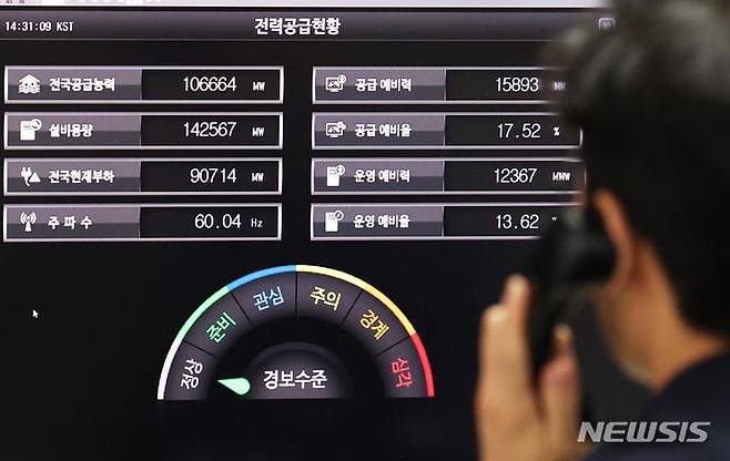[수원=뉴시스] 김종택 기자 = 7일 오후 경기도 수원시 영통구 한국전력공사 경기지역본부 전력관리처 계통운영센터에서 관계자들이 전력수급상황을 주시하고 있다. 정부는 7일과 8일 오후 전력 수요가 92.9GW(기가와트)까지 높아지면서 올여름 최대치를 기록할 것으로 전망했다. (공동취재사진) 2023.08.07. photo@newsis.com