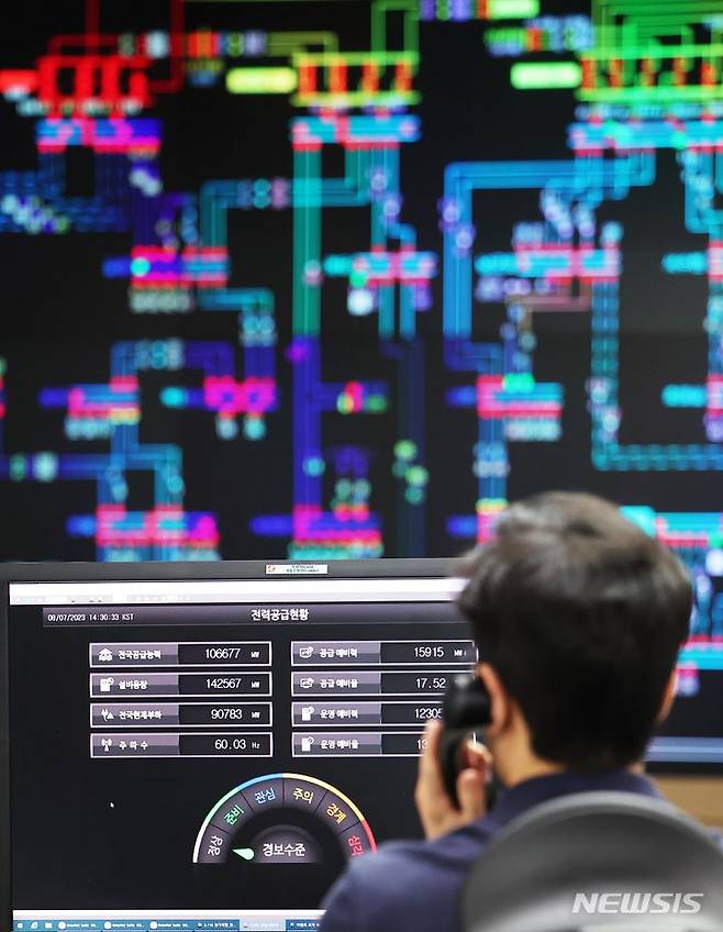 [수원=뉴시스] 김종택 기자 = 7일 오후 경기도 수원시 영통구 한국전력공사 경기지역본부 전력관리처 계통운영센터에서 관계자들이 전력수급상황을 주시하고 있다. 정부는 7일과 8일 오후 전력 수요가 92.9GW(기가와트)까지 높아지면서 올여름 최대치를 기록할 것으로 전망했다. (공동취재사진) 2023.08.07. photo@newsis.com