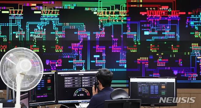 [수원=뉴시스] 김종택 기자 = 7일 오후 경기도 수원시 영통구 한국전력공사 경기지역본부 전력관리처 계통운영센터에서 관계자들이 전력수급상황을 주시하고 있다. 정부는 7일과 8일 오후 전력 수요가 92.9GW(기가와트)까지 높아지면서 올여름 최대치를 기록할 것으로 전망했다. (공동취재사진) 2023.08.07. photo@newsis.com