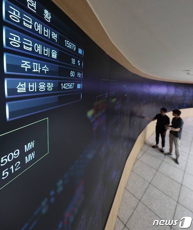 (수원=뉴스1) 김영운 기자 = 올여름 최대 전력수요가 예상되는 7일 오후 경기 수원시 영통구 한국전력공사 경기지역본부 전력관리처 계통운영센터에서 관계자들이 전력 수급 상황을 점검하고 있다.