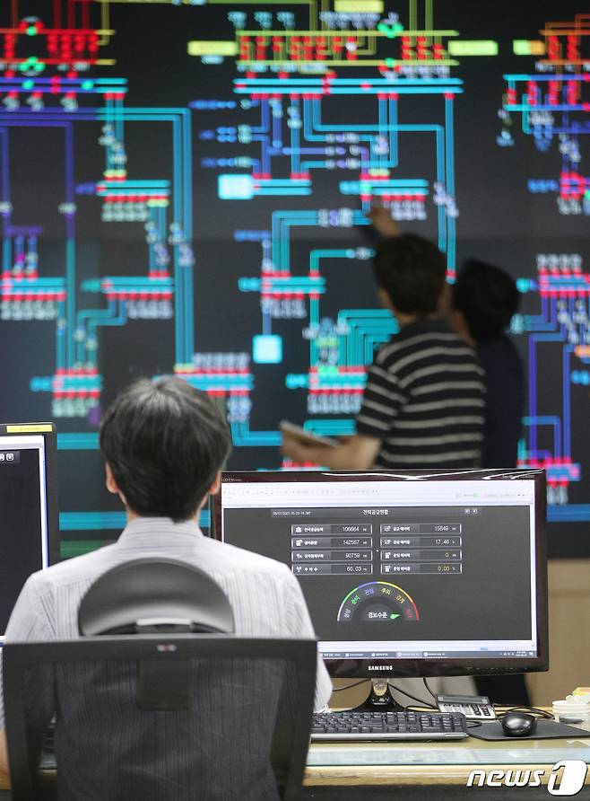 (수원=뉴스1) 김영운 기자 = 올여름 최대 전력수요가 예상되는 7일 오후 경기 수원시 영통구 한국전력공사 경기지역본부 전력관리처 계통운영센터에서 관계자들이 전력 수급 상황을 점검하고 있다.
