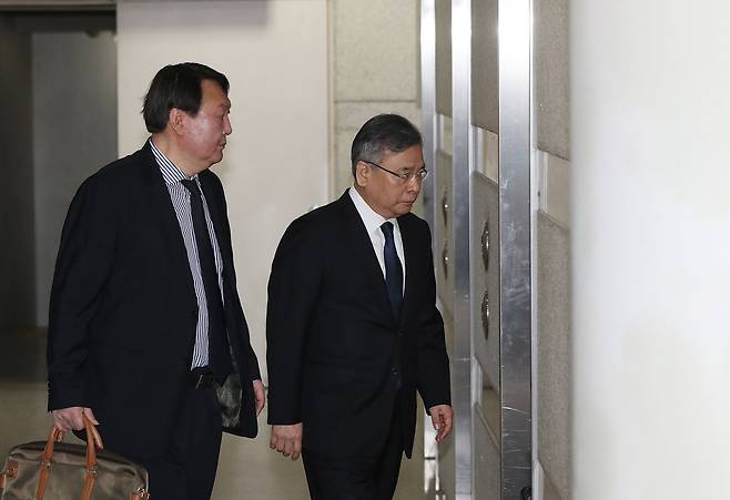 | ▲ 이재용·삼성 재판 직접 등판하는 특검팀 특별검사팀 박영수 특검과 윤석열 수사팀장이 2017년 4월 7일 오전 서초구 서울중앙지법에서 열린 이재용 삼성전자 부회장의 첫 공판에 참석하기 위해 엘리베이터에 오르고 있다. |