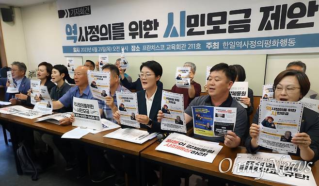 | ▲ 역사정의와 평화로운 한일관계를 위한 공동행동(한일역사정의평화행동) 관계자들이 29일 오전 서울시 중구 프란치스코 교육회관에서 '역사정의를 위한 시민모금 발표 기자회견'을 열고 일제 전범기업 사죄·배상을 요구하며 정부가 제시한 '판결금' 수령을 거부 중인 강제동원 피해자들을 위한 시민 성금 모금에 동참을 제안하고 있다. |